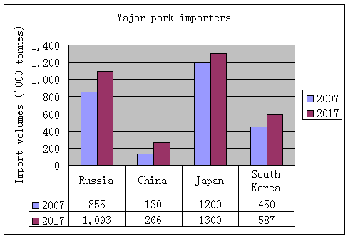 Pork imports would grow significantly in Russia, up 28 percent from 2007 levels by 2017, with volumes up to 1.1 million tonnes by then.
