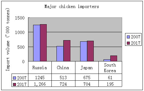Poultry meat imports by major importers are expected to increase about 18 percent or 1.4 million tonnes between 2008 and 2017.