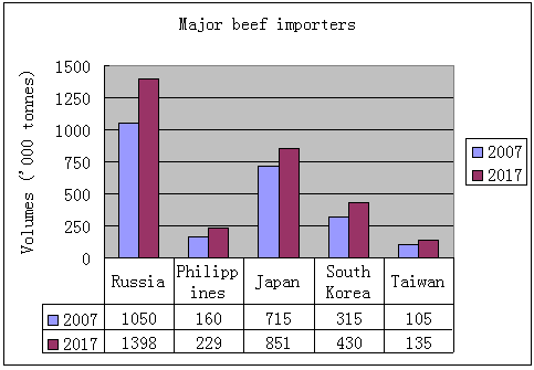 Beef imports by major importers are expected to increase about 23 percent or 1.3 million tonnes between 2008 and 2017. This means beef trade would rise to 7.0 million tonnes by 2017 from 5.4 million tonnes currently.
