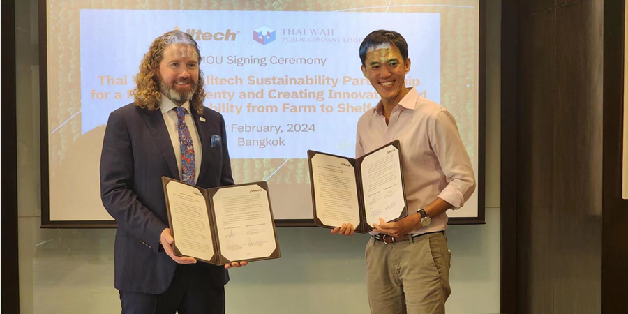 A memorandum of understanding was signed on February 15 by Dr. Mark Lyons, president and chief executive officer of Alltech; Jonathan Forrest Wilson, president of Alltech Asia-Pacific; Ho Ren Hua, CEO of Thai Wah; and Hataikan Kamolsirisakul, chief of staff and AVP for strategy, sustainability and innovation at Thai Wah.