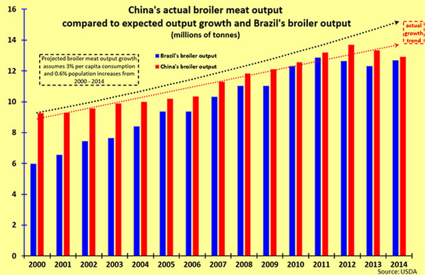 China's far larger population, faster rising incomes and greater scope for expanding per capita chicken consumption all implied that that it should easily maintain or even increase its lead in broiler production over Brazil.