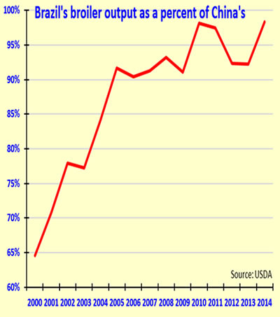 Decades of slack demand growth allows Brazil to catch up to the world's second largest broiler producer.