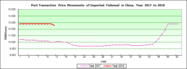 Weekly transacted prices of imported fishmeal at major Chinese ports (RMB/tonne) | ||||||