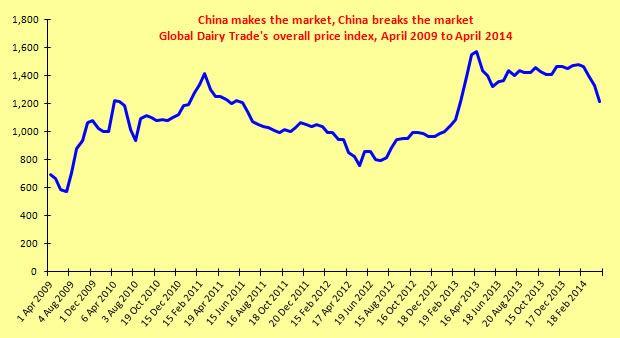 According to a report by Rabobank's RaboAgriFinance division, ("Rabobank Dairy Quarterly -- Q1 2014") China's faltering domestic production fell 6% in 2013, forcing it to jack up milk powder imports just as Australia and New Zealand endured a nasty Q1 2013 drought. This kept prices stable at historically high levels throughout 2013 and into the first quarter of this year.