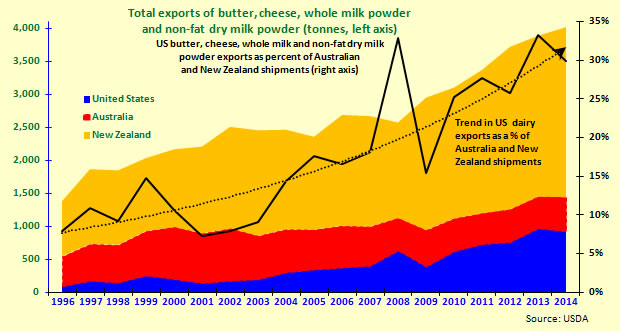 America's growing role in the world dairy market should not be underestimated. It has overtaken New Zealand as in exports of non-fat dry milk powder (NFDM). With NFDM exports up 295% from 2000 levels, America now ships more of this dairy powder than Australia and New Zealand combined.
