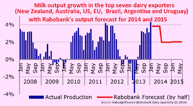 Over the short term, the high prices, high export demand and falling feed costs in the latter half of 2013 caused the milk output of top 6 exporters (New Zealand, Australia, United States, Brazil, Argentina and the EU) to be 3.7% higher in the first two months of 2014 compared to the same period a year earlier. It was motivated by the fact their collective fourth quarter dairy exports were up 11% year-on-year.