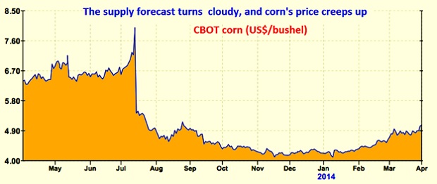 Nonetheless, that sunny supply-side forecast of six months ago is starting to fill up with clouds that look increasingly dark. Nobody knows if a supply-side squeeze is in the offing, but mounting supply-side uncertainty is what has pushed corn close to the US$5/bushel level -and will keep it there, unless there is a considerable change in expectations.