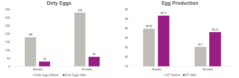 The farm challenge concerns the incidence of the dirty egg problem for the last five-month period at 61 (older flock) and 31 weeks (young flock) of age, laying hens, and low egg production. To address this problem, the layer farmer has been advised to use tributyrin (SpeoCare® T60) supplementation at the rate of 500 gm per MT in laying diets.