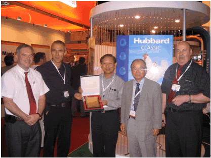 In recognition of Taiwan Hubbard GPS Farm Co. Ltd's long-term partnership with Hubbard Company, Frederic Grimaud, President of Group Grimaud La Corbiere, presented a plaque to Taiwan Hubbard's president A.H. Chuang at VIV Asia 2007 in March.