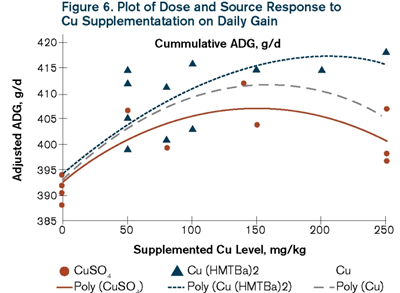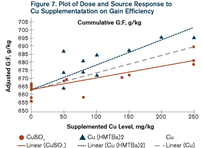 A meta-analysis of 6 trials evaluated the effect of different levels of copper from either Cu MMHAC or CuSO4 on growth performance of nursery pigs. Results indicated that average daily gain quadratically responded with increasing copper supplementation, and the Cu MMHAC source of copper reached higher plateau compared to the inorganic source (Figure 6). The linear slope for increasing copper supplementation for gain efficiency was 2.1-fold higher for Cu MMHAC than that of CuSO4 (Figure 7). Copper MMHAC was more effective than CuSO4 in improving feed efficiency and growth rate.