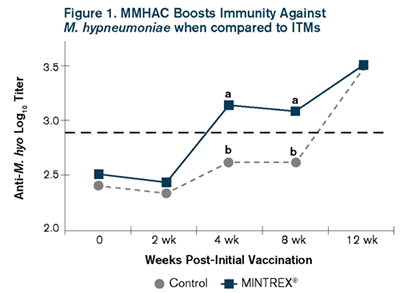 The data suggests that during those eight weeks, replacement gilts fed inorganic trace minerals were not as protected against M. hyopneumoniae as the gilts fed the MMHAC source, and thus the MMHAC source provided a boost to the gilts' immune system'.