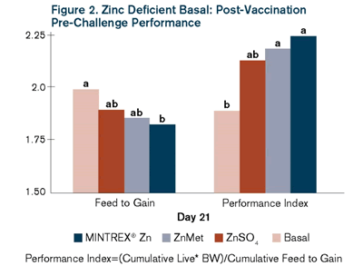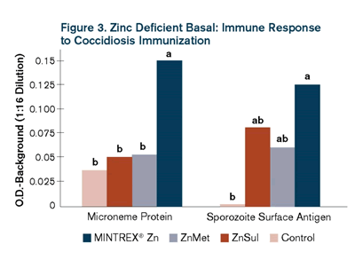 In another study designed to test if zinc can affect the response to coccidiosis vaccination and challenge, animals were vaccinated on Day 0 while being fed a zinc-deficient basal diet, zinc sulfate (ZnSO4), ZnMet or Zn as MMHAC, all at dietary levels of 40 ppm of zinc. The results indicated that zinc supplementation did improve performance of vaccinated animals (Figure 2). The study also indicated the effect of zinc on the immune response to a vaccination. Antibodies to antigens were significantly higher in animals fed MMHAC, which is an indicator of overall positive immune response to the vaccine (Figure 3).