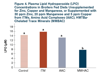 Poor oxidative stress management in piglets can result in decreased performance, compromised immune function and increased morbidity. The role that natural and synthetic antioxidants play in managing oxidative stress are well-recognized, and it is important to understand that trace minerals are critical in these processes. Animals fed MMHAC showed significantly lower levels of lipid hydroperoxides in their blood versus animals fed other mineral sources, indicating lower oxidative stress in animals fed MMHAC (Figure 4).