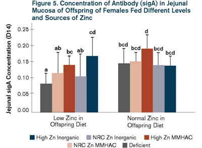 In a study testing if supplementing females with zinc from MMHAC would result in improved gut morphology in their offspring, the data showed significant benefits with maternal and offspring zinc supplementation (Figure 5). A material high dose of ZnSO4 or Zn MMHAC showed increased villus height and width and decreased crypt depth. These results indicate that better zinc supplementation in maternal and offspring diets results in lasting improvements in jejunal mucosa immunity.