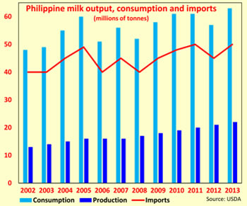 Imported milk powder for from New Zealand, Australia, France and the United States are needed to bridge this large output gap. Although there is no way of meeting this supply shortfall anytime soon, secretary of agriculture Proceso Alcala believes that developing the local dairy industry is an effective strategy for reduce rural poverty.