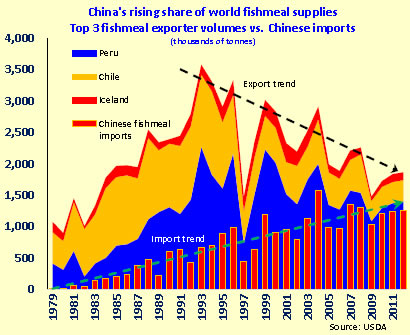 The only problem is that with Peru and Chile supplying three-quarters of fishmeal exports most years, their declining export numbers are coming within shooting distance of China's fishmeal import demand. The latter's growth may slow down but given the tendency of Chinese to eat more expensive, carnivorous species as their incomes rise, the trend will not stop.