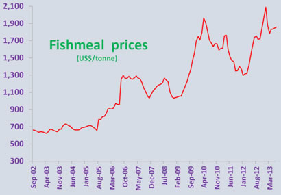 The early 1990s peaking of global fishmeal production, coincided with the moment when the farmed fish production, particularly in leading producer China, accelerated. According to the IMF, from US$480/tonne in January 2001, fishmeal's cost had jumped 318%, to US$2,088/tonne by January 2013. But what is really troubling about fishmeal is that beyond a certain quantity, it is simply not available at any price whatsoever.