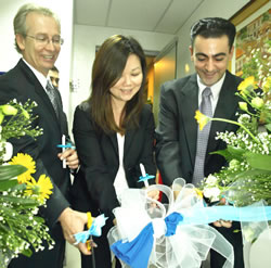 From left: USDA agricultural attache David Wolf, Novus director for finance andoperations in Asia Pacific Cecilia Chan and Novus regional and sales director Yiannis Christodoulou during the ribbon cutting ceremony |
