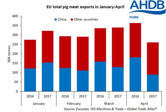 The EU's total pig meat exports, including offal, to all third countries (non-member states) fell 4% year-on-year during the first four months, AHDB Pork said, citing the latest figures from Eurostat.