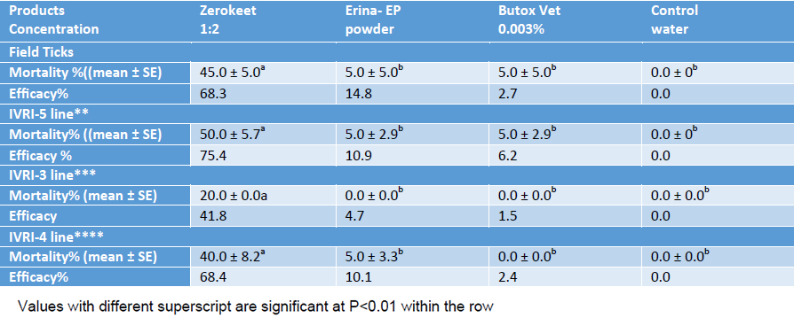 Comparing the efficacy of different products against individual tick line it was observed that Zerokeet provided maximum efficacy of 75.4 % against multi acaricide resistant IVRI-5 line followed by similar comparative activity against IVRI line-4 and against field ticks, the efficacy against diazinon resistant ticks was minimum of 41.8 %. In comparison to Zerokeet, the activity of other markedly available natural and synthetic products conferred insignificant protection against all the tick lines and field ticks (Table 1).