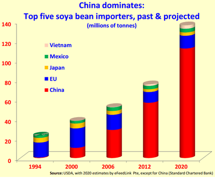 To close that nutritional gap, most of that 8% percent difference between Chinese and western carbohydrate intake levels will need to be bridged with additional protein - and soy is by far the most important protein meal that livestock convert into meat, milk and eggs. Even in aquaculture, high fishmeal prices are causing the proportion of aqua feed accounted for by soymeal to skyrocket.