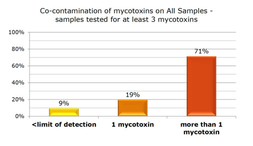 The results show that 90% of all samples contained at least one mycotoxin. Of these, 71% contained at least three mycotoxins (figure 2). The phenomena of co-contamination inevitably leads to synergism, a condition where the severity of one mycotoxin is increased by the presence of others.