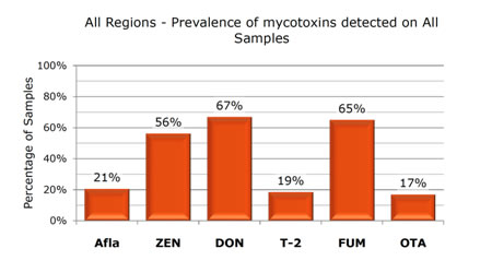 The main mycotoxins detected are deoxynivalenol, fumonisins and zearalenone, detected in 67%, 65% and 56% of all samples respectively. The average levels were 728 ppb for DON, 1,678 ppb for FUM and 135 ppb for ZEN. Other mycotoxins such as Afla, T-2 and OTA, were detected in 21%, 19% and 17% of samples analysed respectively. (Figure 1).
