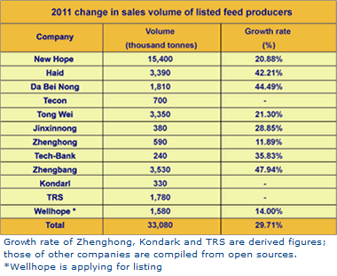 According to these companies' annual report statistics, their combined sales of feed in 2011 increased by a prominent 29.71% from 2010 levels. With the addition of Wellhope Agri-Tech, (which is currently applying for listing), these 12 companies produced a total of 33 million tonnes of feed last year, accounting for 19.58% of China's supply - the result of consolidation over the past several years.