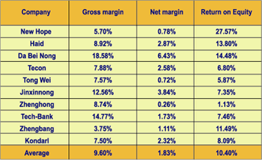 Last year, other than Kondarl, whose net profit jumped 36% due to a sharp rise in water supply business' revenues, the gross and net profit margins of all listed feed companies were on the low side. Da Bei Nong achieved the highest gross profit margin of 18.58% while Zhengbang had the lowest, at 3.75%; on average, the gross profit of listed feed companies was 9.6%. Although feed producing enterprises enjoy tax benefits, the net profits of feed manufacturing were unimpressive.Da Bei Nong recorded the highest net profit margin of 6.43%, while Jinxinnong, Haid and Tecon had about 2% of net profit margin. Other listed feed companies made less than 1% net profit margins. However, feed companies have done well with regards to return on equity (ROE), ranking among the highest in agribusiness. This is because of the high turnover and sales of the feed industry.