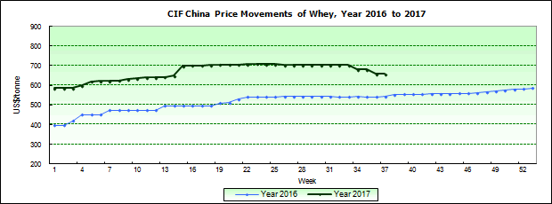 Remarks: Prices refer to CIF China price quotes (US-Dollar) of low-protein whey and are for reference only. |
