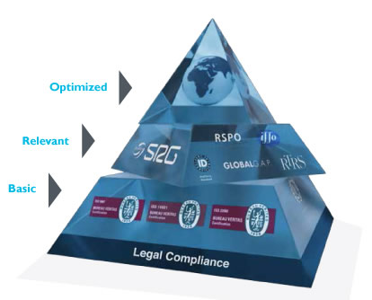Sustainable sourcing of raw materials from certified origins, among other laws and regulations, fall under Legislation and Regulations. At the Fundamental level, BioMar has received the ISO 9001, 14001 and 22000 certifications, which refer to quality management, environmental management and food safety management respectively. The relevance and significance of these different standards and analyses for raw materials are assessed by the BioMar Sourcing Review Group at the Relevant level, and the Group then approves raw materials for the company. At the Optimised level, an environmental and financial impact assessment is conducted, with resource and energy consumption, spatial area utilisation, emissions, and potential toxicity and risks taken into account.