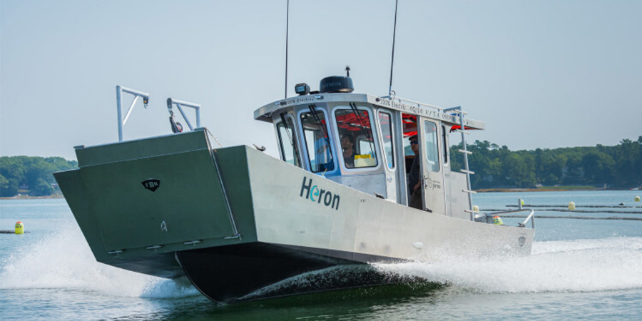 Enter the Heron, a 28'x10' x1'10" all-electric aluminum landing-craft-style workboat conceived by Eric Oransky and Willie Leathers, founding partners of Maine Ocean Farms, an oyster operation in Casco Bay. The two met as officers on sailing ships.