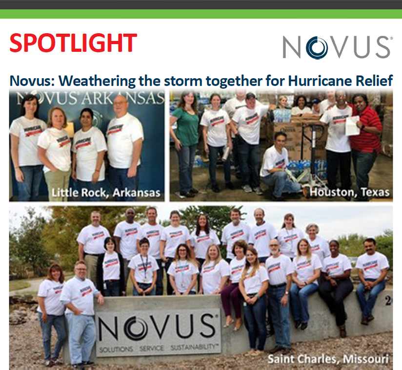 does not matter. Part of the Novus team was impacted from the recent hurricane, prompting the entire company to help. Novus raised over US$20,000 to aid those affected by the storms in Texas. Some of the company's workforce includes manufacturing and business offices in the Lone Star state. When Hurricane Harvey hit the Houston area, Novus employees faced damages to their homes and roadways. Thankfully, all employees weathered the storm and returned to work safely in a few days, but a few had suffered significant damages. Many Novus employees in other offices in the US felt moved to support their southern colleagues so an idea was hatched to initiate a company fundraising effort. Barbara Stampfli-Savill, Novus vice president and chief people officer, sent a call for volunteers across the organisation to help the area