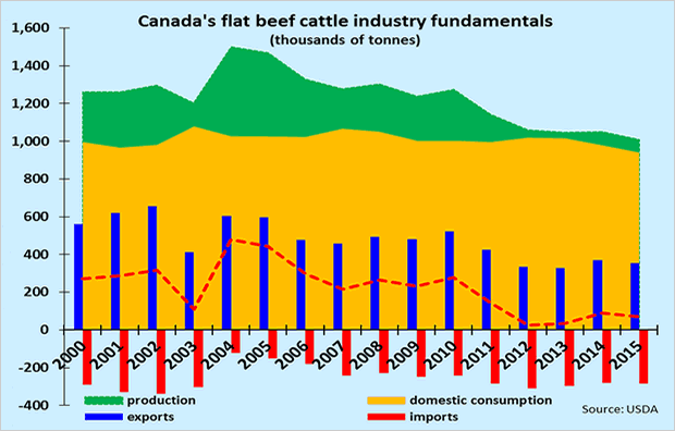 Whereas 2015 US beef production is projected to be 14.2% below its 2002 all-time high, Canada's beef output of 1.01 million tonnes will be a whopping 32.7% below its 2004 peak of 1.5 million tonnes.