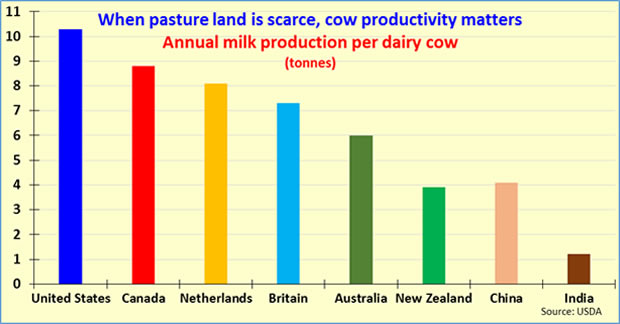 Essentially, pastureland dairy farming is considerably less intensive, has significantly lower dairy cow productivity and lower milk yields per hectare of land. By relying on pasture land, milk output fluctuates in response to seasons and weather conditions, irrespective of actual export demand.