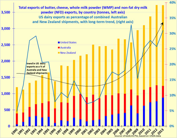 This can be seen in the changing dairy market fortunes of the United States and Australia. According to USDA figures, in 2001, American shipments of butter, cheese, whole milk powder and non-fat dry milk powder amounted to only 20% of Australian exports of these dairy lines. By the late 2000s, American overtook Australia in these dairy exports and in 2013, the United States shipped 2.44 times more the volume of these dairy products than Australia.