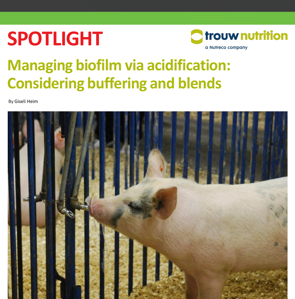 Biofilm is an accumulation of microorganisms and organic and inorganic matter bound by extracellular polymer substances. As microorganisms attach and grow on the water's surface, they can form a "slime" that adheres to water pipes and storage tanks. The biofilm itself also provides an environment for microorganisms such as bacteria, mould and yeast to replicate. These contaminants can make their way to drinking nipples, presenting a risk to livestock as pathogenic bacteria can result in diarrhoea and compromised growth. Similarly, yeast and mould in drinking water may interfere with animals' digestion, give water an undesirable taste, odour, colour or texture, and even impact the health of animals. In summary, the consequences of biofilm include pathogen risk, as well as other concerns including decreased water intake, compromised drinking equipment, water flow reduction, clogged drinkers, etc. Managing biofilms While there are many ways to counteract the biofilm, the most used methods are: flushing, hydrogen peroxide, chlorination and acidification. A particularly effective approach is to use a combination of these methods. Flushing should be applied after any treatment is delivered via water (i.e., antibiotics, vaccines, vitamins, etc). Hydrogen peroxide is a very effective method for managing biofilm and is commonly used in between cycles – always followed by flushing. Chlorination is highly effective as a maintenance tool, but its efficacy depends on careful attention to dosing and water pH. Water acidification with organic acids improves water quality with the added benefit of supporting animal performance and health in two key ways: First, water acidifiers reduce the pH of water to a level below 4; a pH at which many pathogenic bacteria struggle to survive. Second, at stomach level, the undissociated form of organic acids may control gram-negative bacteria that reach the stomach via contaminated feed or faeces intake. Especially for young animals (gastric pH is about 4-5, and mature animals 2-3), organic acids can dissociate in the stomach (as pH is higher than the organic acids pKa (quantitative measure of the strength of an acid in solution; lower the pKa, stronger the acid). It is the equilibrium constant for a chemical reaction), acidifying the gastric content, supporting protein digestion. Pepsin (a protease) is most active at a low pH, and a low pH is required for the efficient digestion of most plant- and animal-derived proteins (other than milk). In addition, an acidic stomach environment also results in control of most pathogens that enter the digestive system through feed and water. With less undigested protein reaching the hindgut (less pathogenic bacteria that thrive on protein, especially to the opportunistic ones as Escherichia coli) and microbial control in the stomach, less pathogenic bacteria in the intestines may result in improved performance and healthier animals. Water buffer capacity With any treatment, it is important to understand the mode of action, and this applies to water acidification. Water can be classified according to its buffer capacity/alkalinity; whether it is low, moderate or high. Simply defined, alkalinity is the capability of water to resist pH changes or, in other words, the total amount of bases present in water. Following is a more formal definition: Alkalinity is a measurement of water's buffering capacity or its capability to neutralize acids.Alkalinity is typically expressed in ppm of CaCO3 (calcium carbonates) equivalents. The bases are derived from limestone or dolomite sources in nature as calcium ions, magnesium ions and carbonates mixed with water. As the calcium and magnesium ions dissolve, they result in water hardness, while carbonates deliver a water's alkalinity. The more carbonates present in water, the higher its buffer capacity. Understanding the buffer capacity makes it possible to determine which type of acidifier (single or blend, buffered or non-buffered) to use in drinking water and equally important, the application rate to recommend. Buffered or non-buffered and at what dose? Drinking water acidifiers are increasingly used to effectively reduce drinking water pH, support optimal stomach acidification and digestion, and achieve an optimal gut microbial balance. However, the type of acidifier (single or blend, buffered or non-buffered) and dosage are dependent on the buffer capacity of the water. In water with high buffer capacity (high alkalinity), a higher inclusion rate of acidifier is required to reach the recommended pH of approximately 3.8-4.0 – the range at which pathogenic bacteria struggle to live. For non-buffered or less buffered acidifiers, a lower dosage is required to reach the target pH (this is valid for each type of water). A blend of acids is an interesting approach when the objective is water acidification and animal effects such as an improvement in digestion, gastrointestinal microbial balance or improved animal performance. Of special importance is achieving proper dosage. Higher amounts of a water acidifier will make more of the acid molecules available in the animal to support desired effects. Water titration The proper application rate of a water acidifier can be determined based on titration analysis of the specific water supplied to the animals. Water titration can be used to determine the inclusion rate of an acidifier based on the alkalinity of water and the target pH. Water titration can be performed by a laboratory or on the farm using specially designed tools. For example, Trouw Nutrition's farm experts employ a tool that includes a photometer and application rate calculator to help recommend a specific inclusion rate for the drinking water acidifier based on the water's alkalinity. The on-farm titration analysis translates the alkalinity value of a water sample to a drinking water acidifier dosage to reach the desired or advised level of pH. This is an easy and straightforward proce