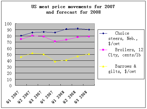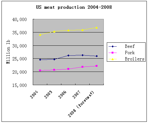While pork and broiler production would rise 1.8 percent and 2.7 percent respectively in 2008 compared to 2007, beef production would decline by 1.3 percent.